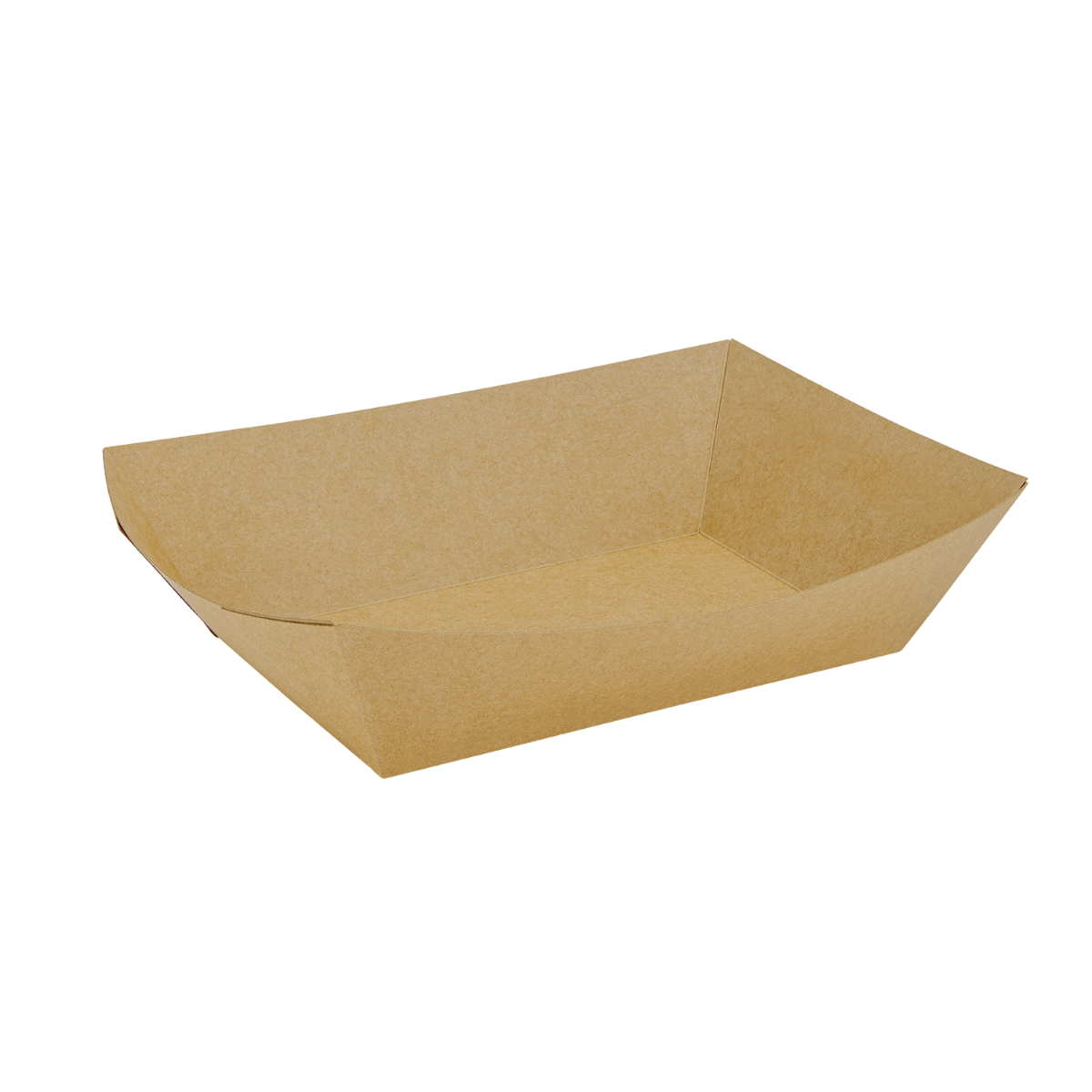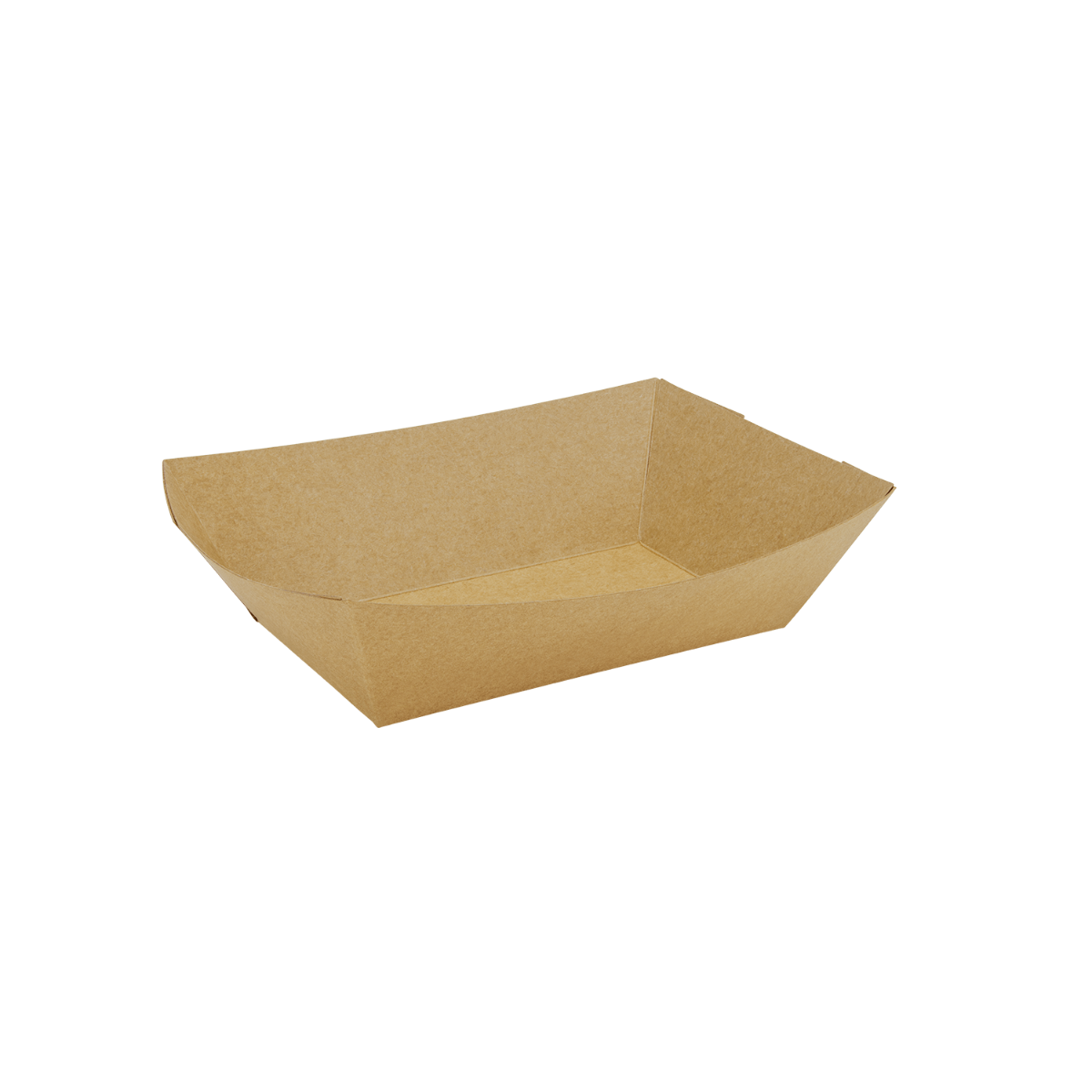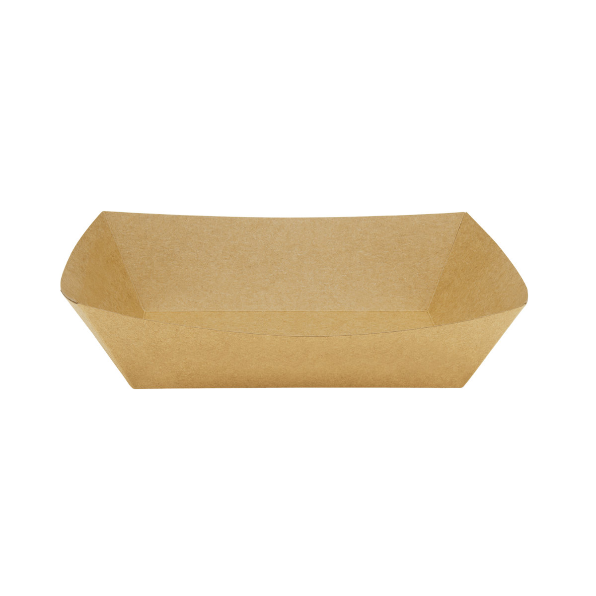 Paper Food Tray, Compostable, Kraft. A small, eco-friendly food tray made from brown kraft paper. The compostable material is a sustainable choice for serving small appetizers, fries, or desserts.