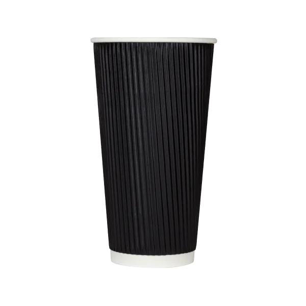 20 oz Paper Hot Cup, Ripple, Black. A large-capacity hot cup with a stylish black ripple design. The triple-wall construction provides exceptional insulation, making it the perfect choice for large hot beverages on the go.