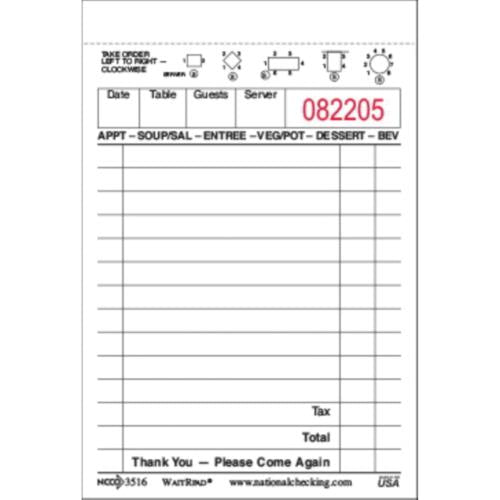 Guest Checkbook, 13 Lines, 100 Checks per Book, Green. A standard guest checkbook for restaurants and cafes. It features 13 lines for efficient order-taking, and the green design makes it easy to spot in a busy environment.
