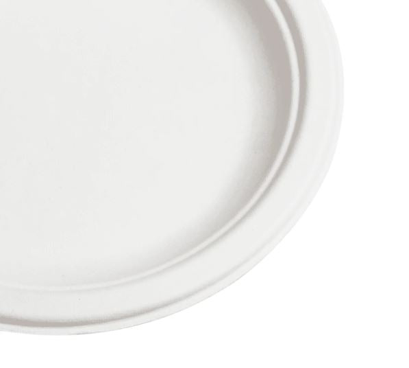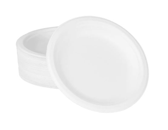 Free. A small, compostable round plate made from natural bagasse fiber. The PFAS-free material is a safer and more sustainable choice for serving appetizers and desserts.