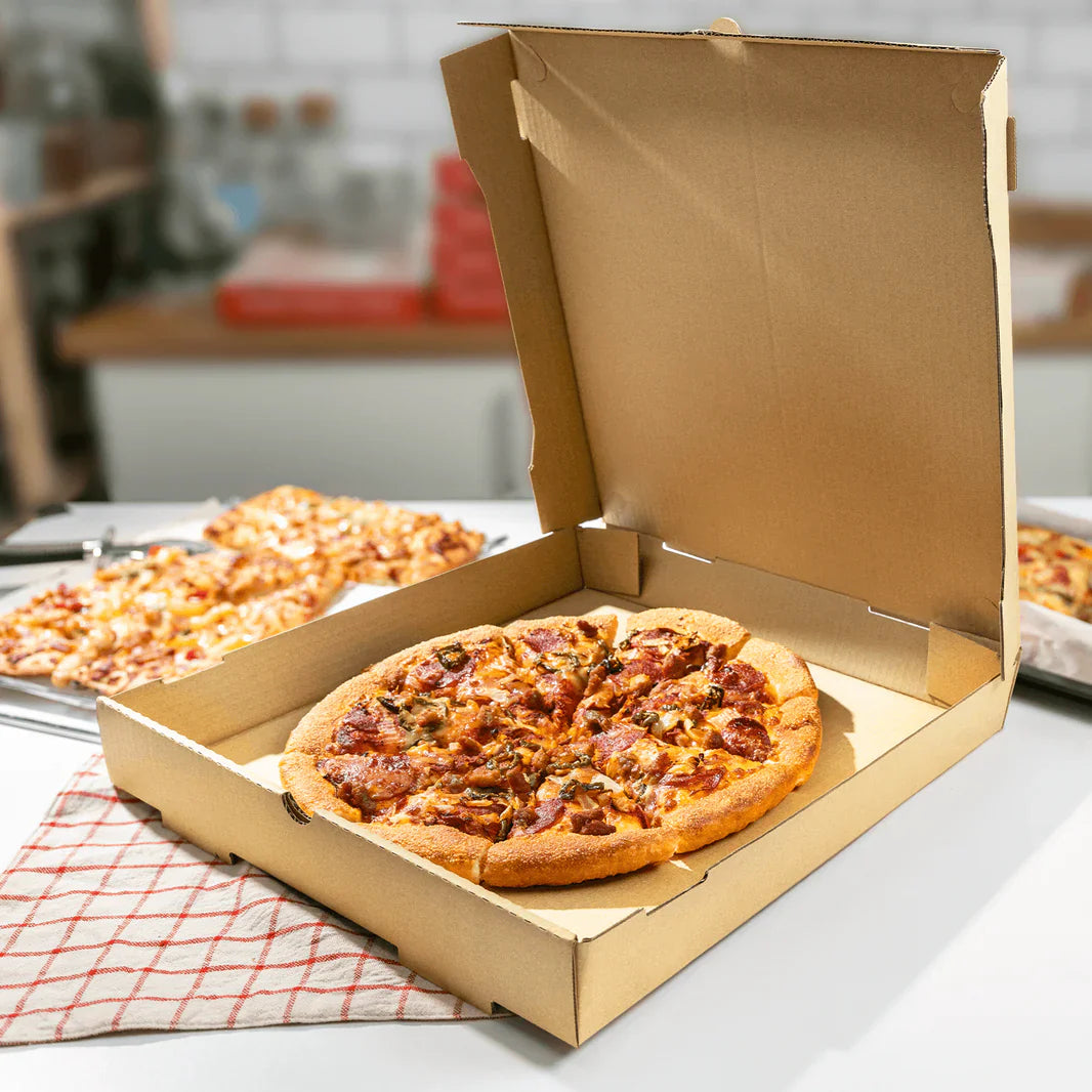 Pizza, Kraft. The Go-To for Your Standard Pie. This corrugated box is the industry standard for 14" pizzas. The strong, insulating construction keeps the pizza hot and safe, ensuring customer satisfaction every time.