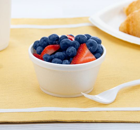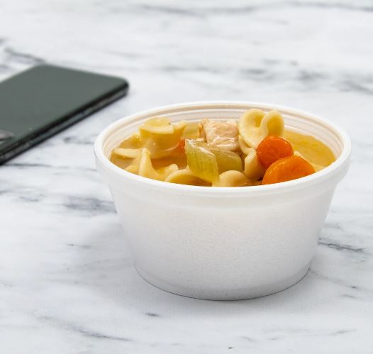 Foam Food Container, White. A small, squat foam container that is perfect for soups, ice cream, or small sides. The durable Dart foam and stable design make it a reliable choice for any takeout order.