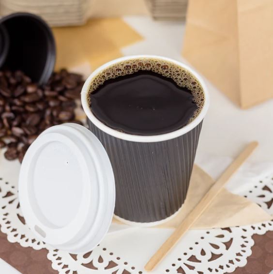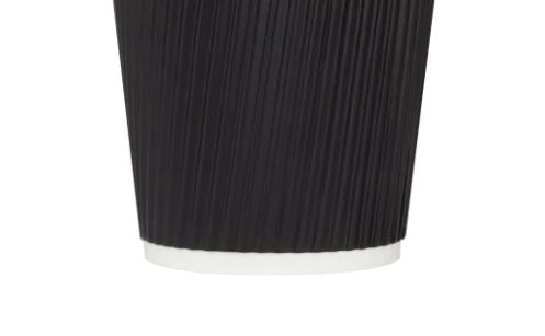 8 oz Paper Hot Cup, Ripple, Black. A stylish and insulated hot cup with a sleek black ripple design. The triple-wall construction keeps beverages hot while providing a comfortable, no-slip grip.