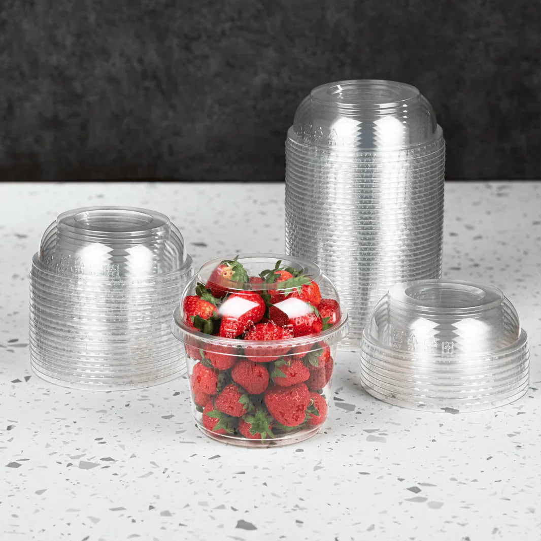 Round Deli Container. Designed to fit a range of round deli containers, this dome lid provides extra space for toppings and sauces. The crystal-clear PET material offers high visibility and a secure snap-on fit.