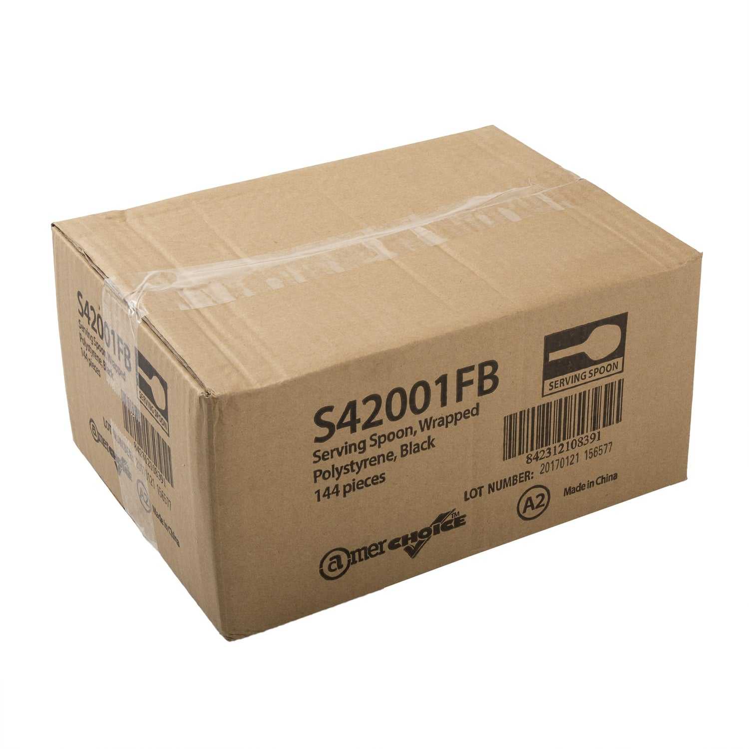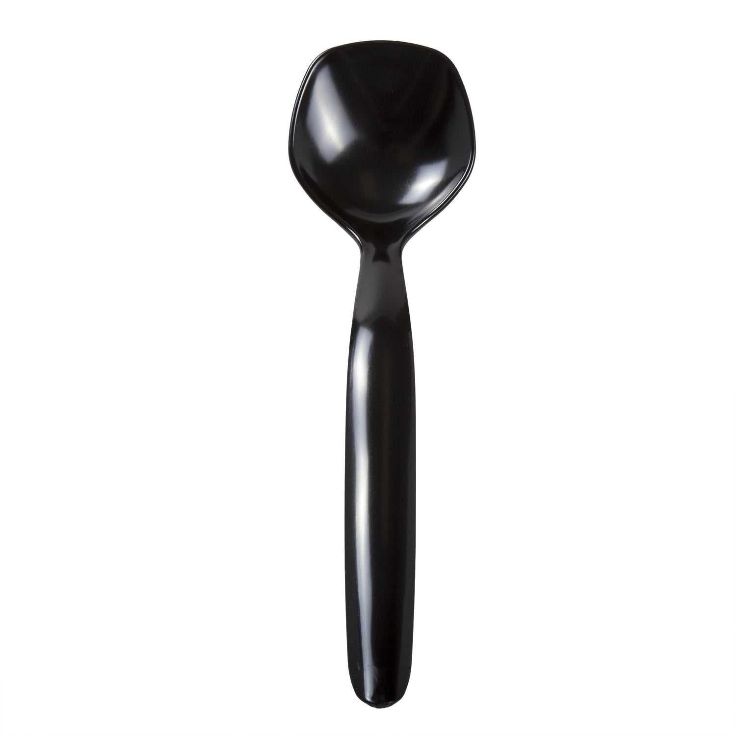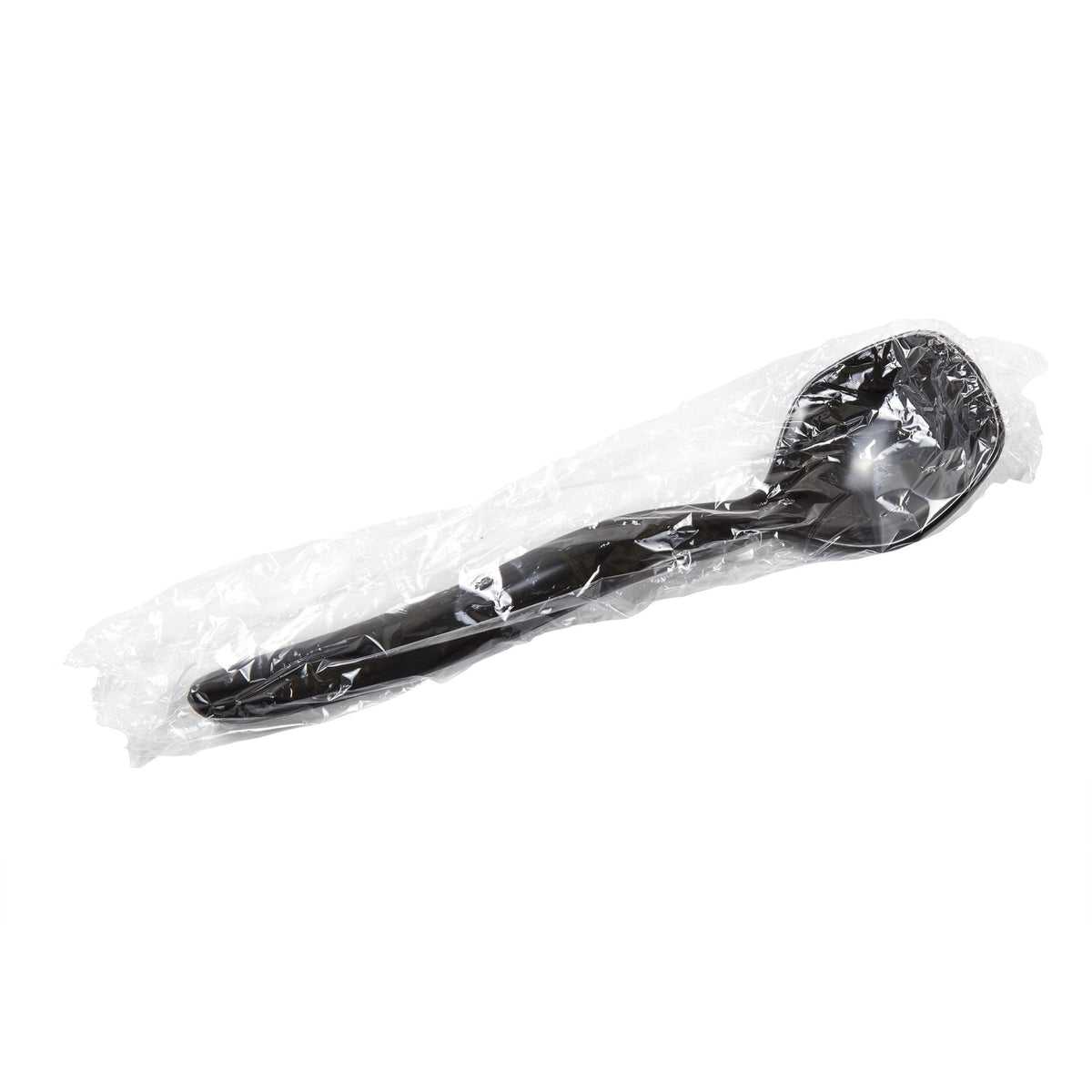 Serving Spoon 8.25" Black PS, Wrapped. A durable, medium-length serving spoon that is individually wrapped for hygiene. The black polystyrene provides a professional look, and the heavier weight makes it reliable for buffets and catering.