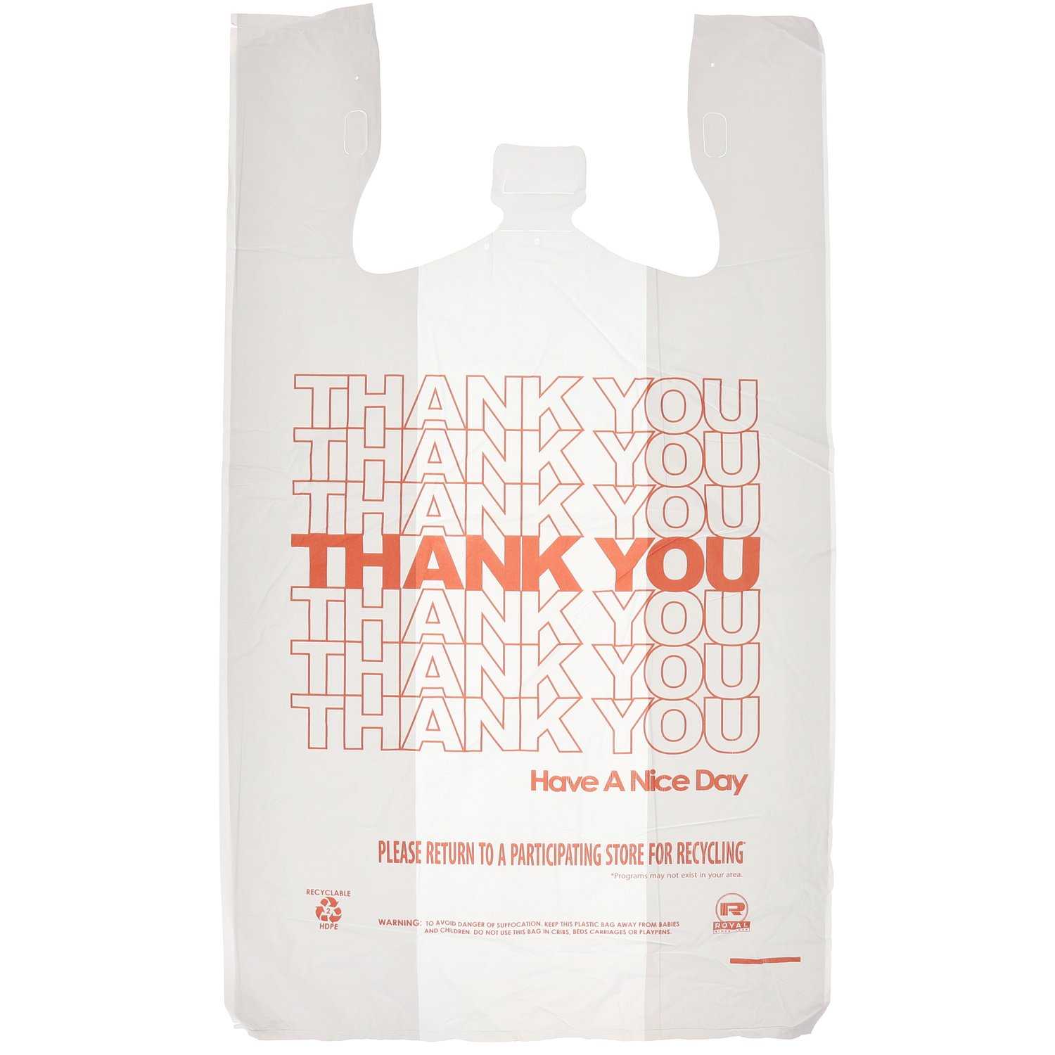 T-Shirt Thank You Bags, Medium, 14 Mic. A larger, heavy-duty t-shirt style bag with a "Thank You" message. The 14-mic thickness provides extra strength for heavier groceries and larger items.