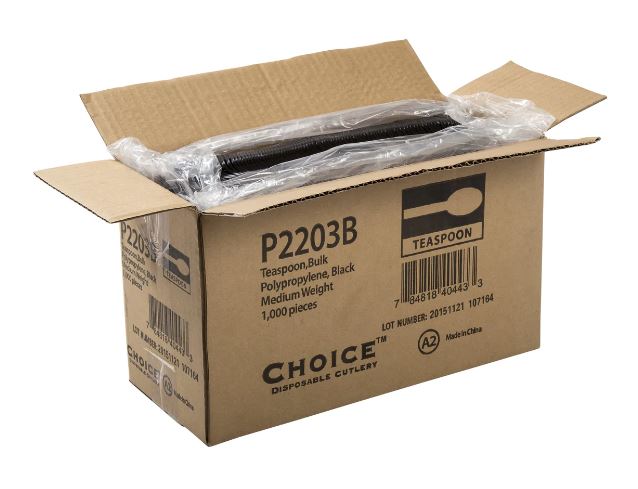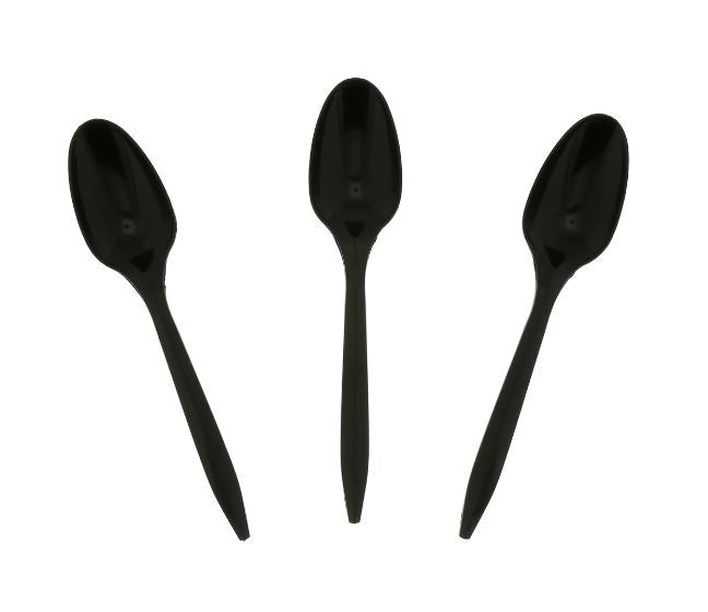 Teaspoon, Medium Weight, Black, PP, Bulk. A medium-weight black teaspoon that is a cost-effective and versatile choice for coffee, tea, and desserts. The bulk packaging is perfect for high-volume use.