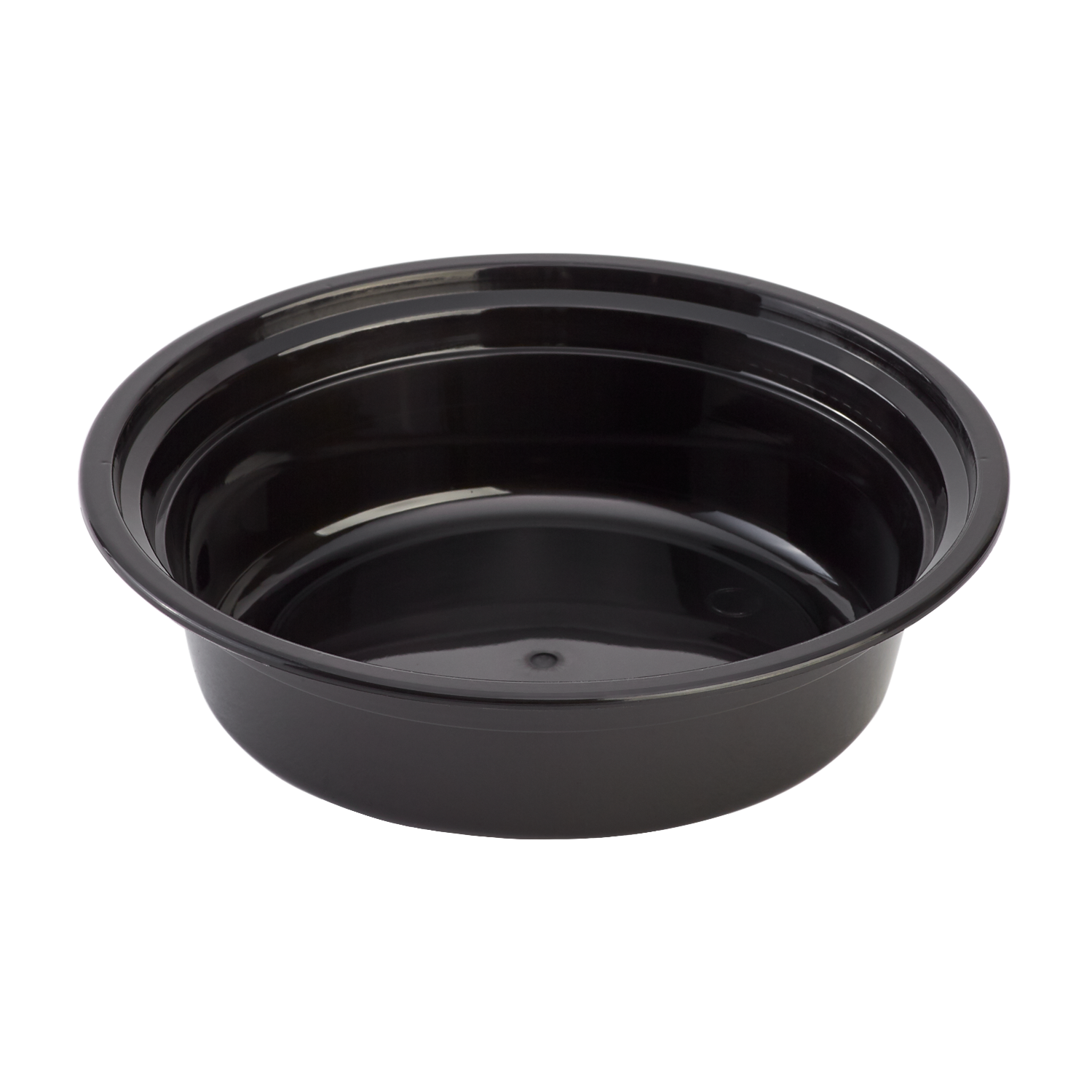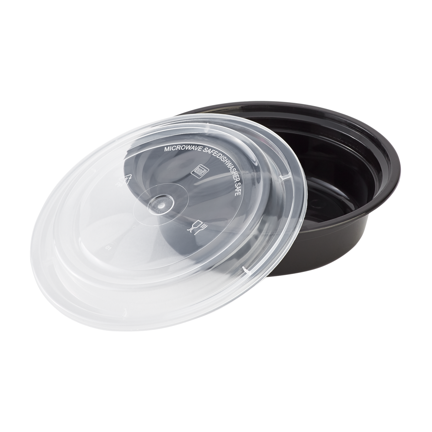 16 oz. Round Container, Black Bottom and Clear Lid. A round, 16 oz container perfect for soups, pasta, and salads. The black polypropylene base and clear lid combo provide a durable, microwave-safe solution for takeout.