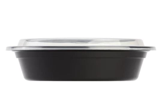24 oz. Round Container, Black Bottom and Clear Lid. Modern Round Style for Soups and Salads. Give your takeout items a modern edge with this 24 oz round container. The black base is ideal for hot liquids or vibrant salads, sealed with a tight-fitting clear lid for leak-free transport.