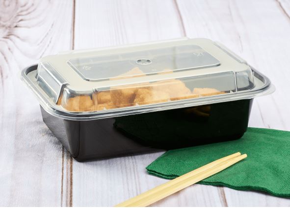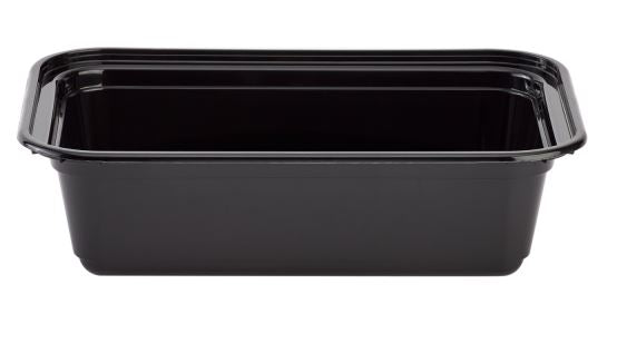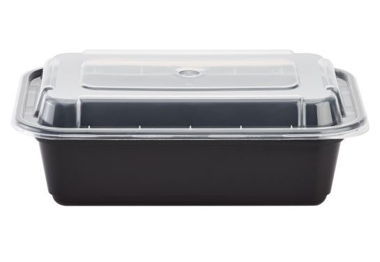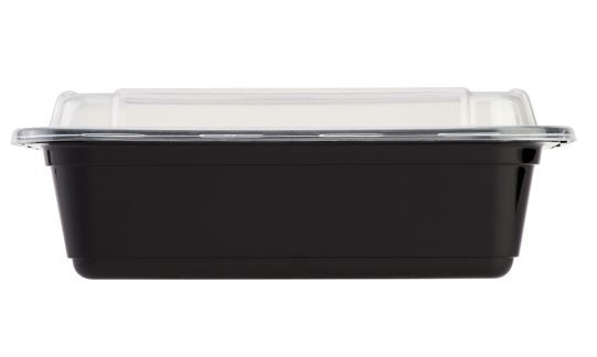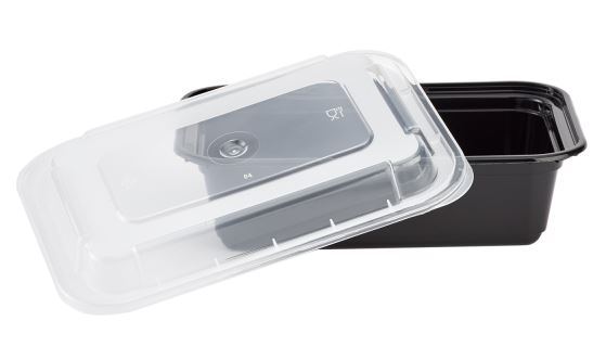 24 oz. Rectangle Container, Black Bottom and Clear Lid. A medium-sized rectangular container with a secure lid combo. The microwave-safe polypropylene base is great for reheating food, while the clear lid allows for easy content identification.