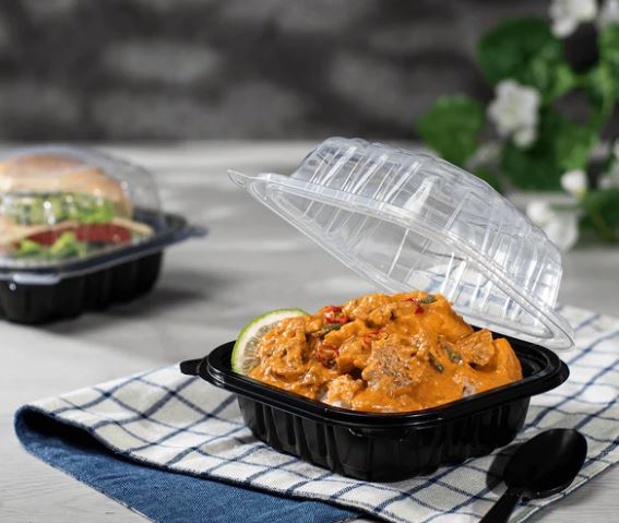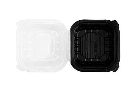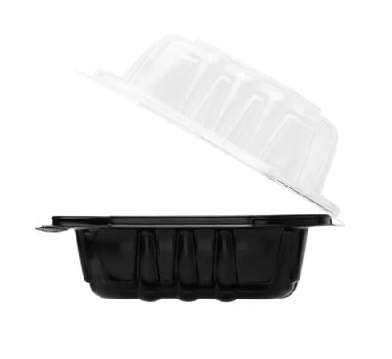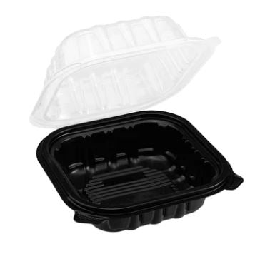6" x 6" PP Hinged Container, Vented, Black Bottom and Clear Lid. The Ideal Small-Plate Solution. This compact container is perfect for sides, appetizers, or single servings. The appealing black-and-clear contrast elevates presentation, while the vented lid is great for keeping hot sides like fries or rice fresh.
