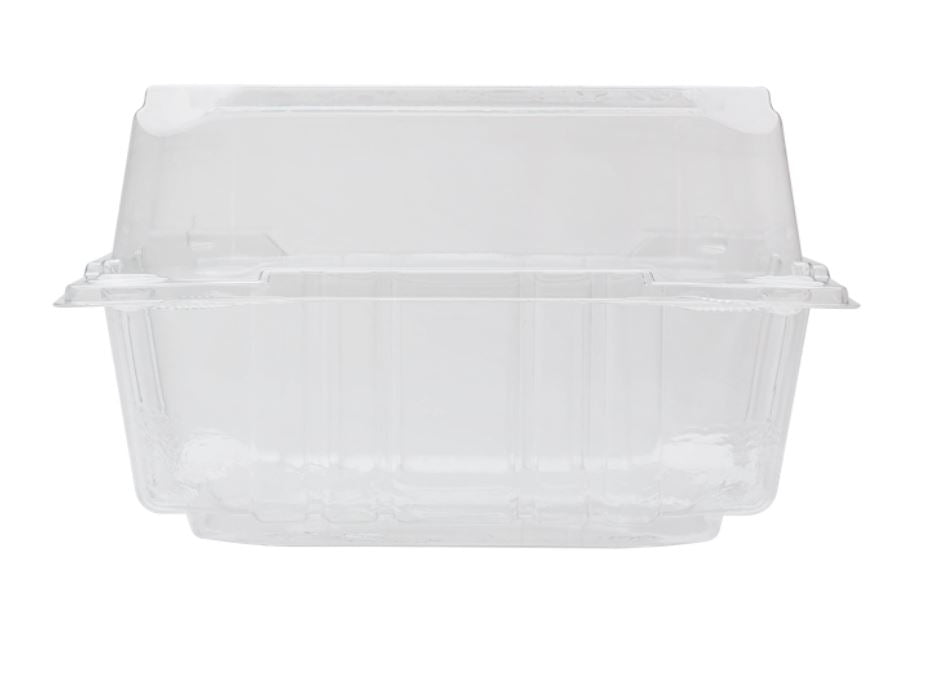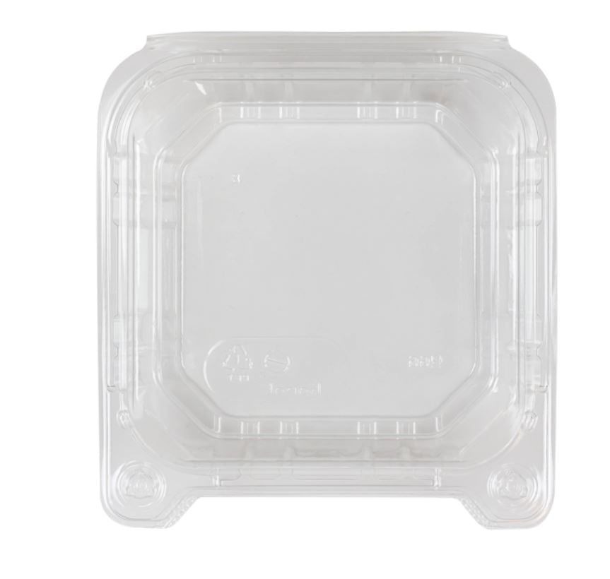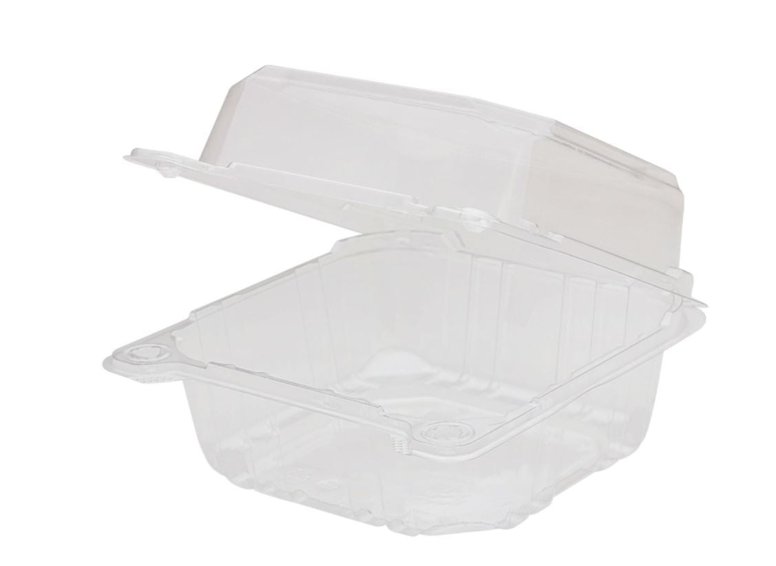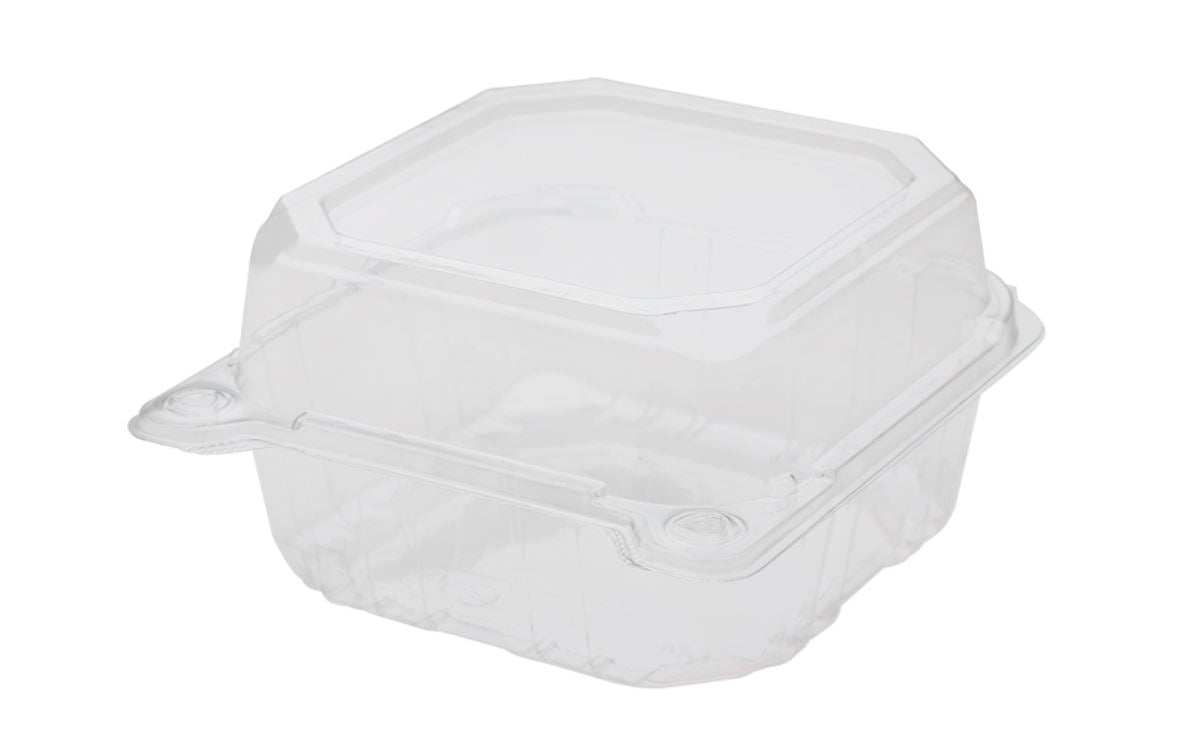 6" x 6" PET Hinged Container, Clear. A classic clear clamshell container perfect for baked goods, sandwiches, and salads. The hinged lid provides a secure seal while offering a crystal-clear view of the contents.