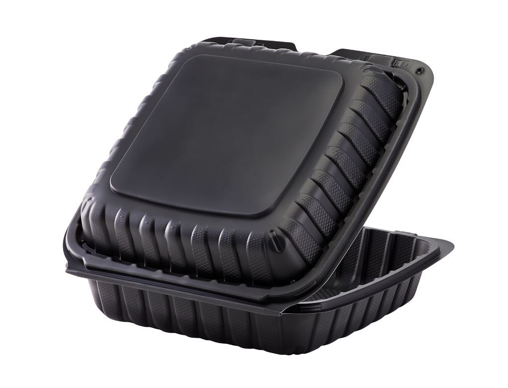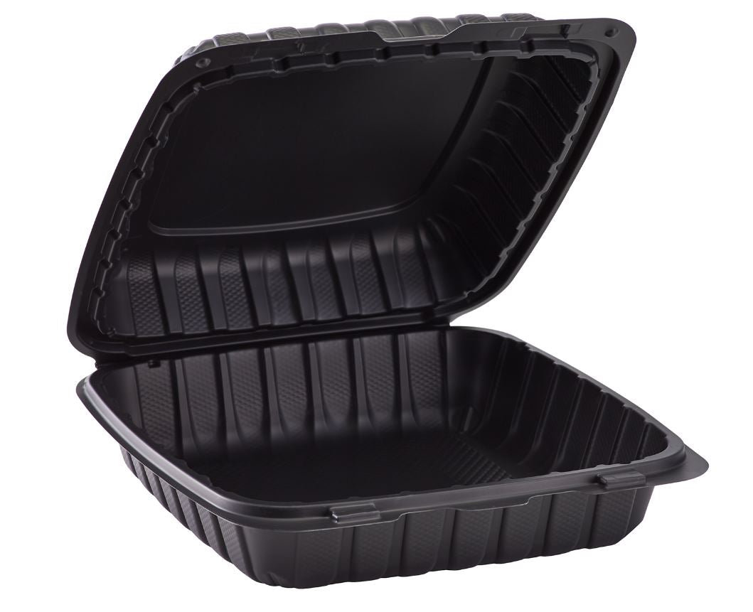 9" x 9" MFPP Hinged Container, Vented, Black. An eco-friendly hinged container with a single compartment, perfect for hot and cold entrees. The micro-flute polypropylene (MFPP) provides superior insulation, and the vented lid prevents sogginess.