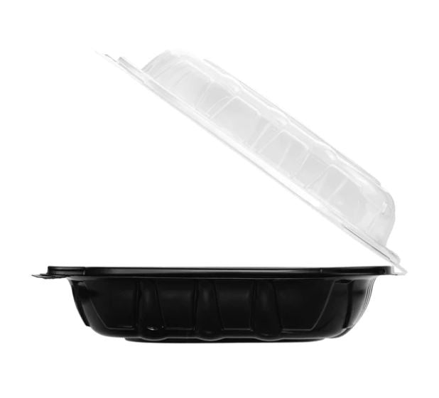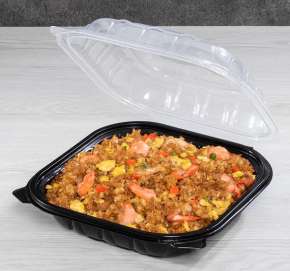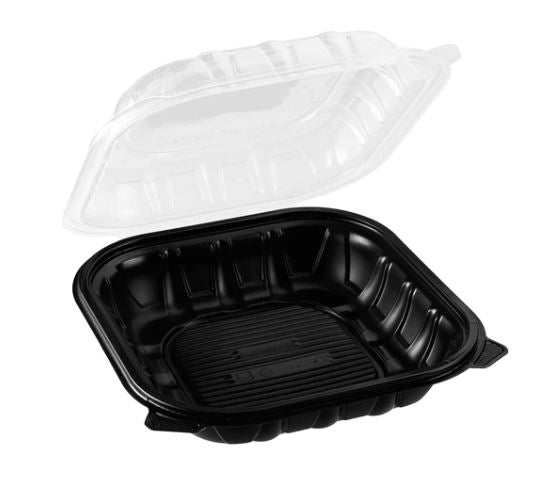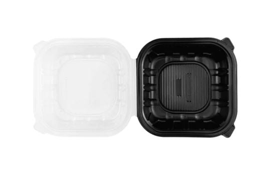 9" x 9" PP Hinged Container, Vented, Black Bottom and Clear Lid. This hinged takeout container combines a sturdy polypropylene base with a crystal-clear lid for excellent visibility and presentation. The vented design helps release steam to maintain food texture and freshness during transport. Its 1-compartment layout offers a clean and simple solution for standard meal portions while the hinged construction ensures secure closure for on-the-go service.